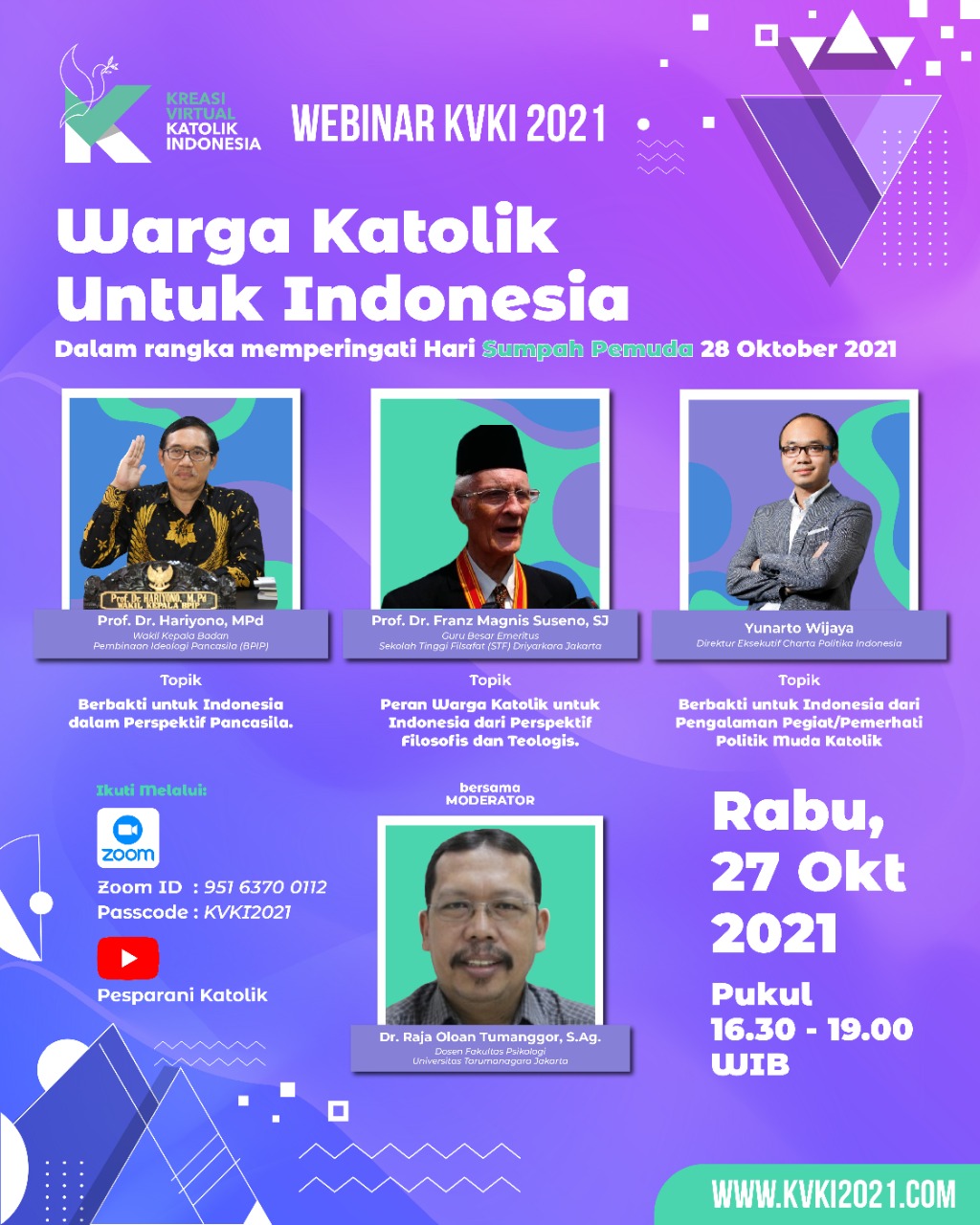 HIDPKATOLIK.COM – Kreasi Virtual Katolik Indonesia (KVKI) 2021 tak hanya menggelar lomba-lomba (Cerdas Cermat Rohani, Tutur Kitab Suci dan Mazmur), tapi juga webinar menyambut peringatan Sumpah Pemuda. Webinar ini akan dihelat sebagai pamungkas gelaran KVKI 2021 sebelum closing ceremony pada tanggal 28 Oktober 2021.