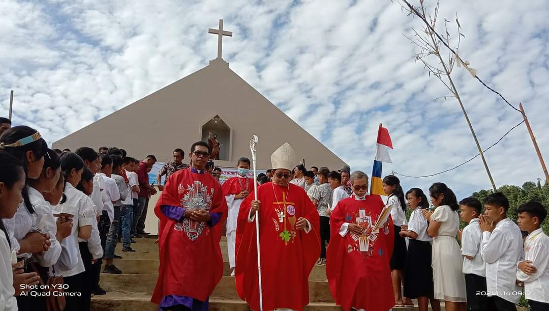 HIDUPKATOLIK.COM – Disambut secara meriah, Uskup Padang, Mgr. Vitus Rubianto Solichin SX meresmikan dan memberkati Gereja Stasi Petrus, Simalibeg, Simatalu, Kecamatan Barat, Mentawai, Kabupaten Kepuauan Mentawai, Sumatera Barat, Minggu, 14/11/2021. Stasi ini masuk dalam lingkungan Paroki Stella Maris, Siberut Barat.
