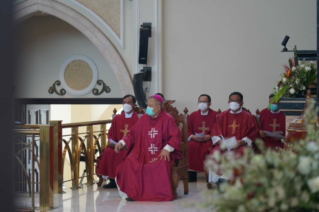 Mgr. Vincentius Sutikno Wisaksono (depan) bersama para imam dalam Misa di Paroki St. Yakobus Surabaya.