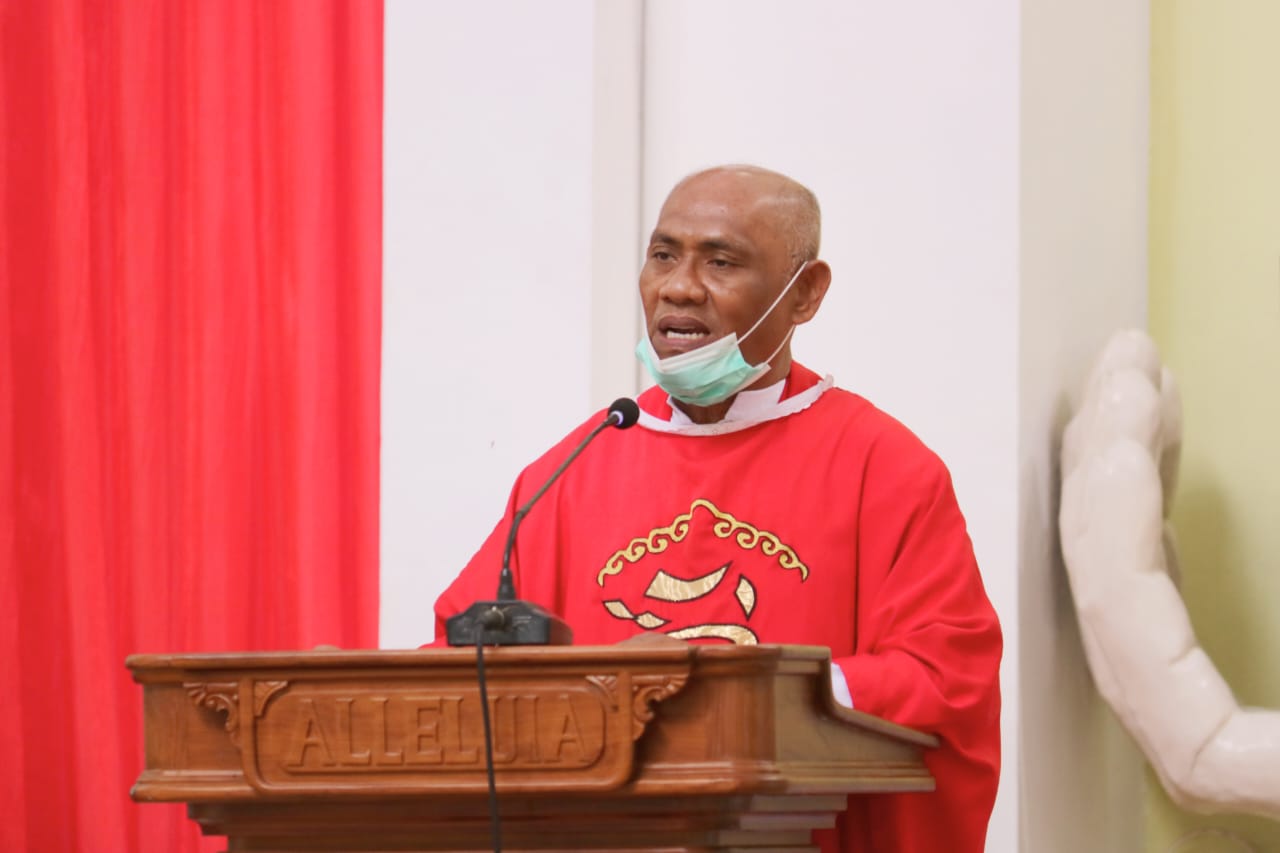 Dalam khotbahnya,Uskup Mandagi menegaskan  bahwa, “Pada Hari Raya Pentekosta setiap orang katolik diberikan Roh Kudus, Roh Penolong yang menyertai umat sampai selama-lamanya. Maka di tengah-tengah godaan dan  ancaman, orang Katolik punya sahabat yang istimewa yaitu Roh Kudus. Roh tinggal dalam hati dan bergerak  dari dalam  dan tidak kelihatan.’’