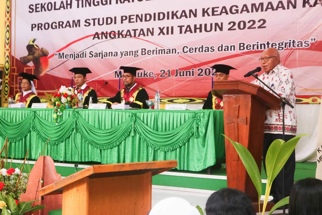 Sekretaris Kuskupan Agung Merauke, Pastor Johanes Kandam, dalam sambutannya mengatakan bahwa, saat ini masih banyak kekurangan guru agama di sekolah dan paroki-paroki. “Wisuda hari ini tidak hanya bangga dalam ruangan ini karena telah diwisuda tetapi bangga ketika tampil dilingkungan, paroki dan sekolah-sekolah sehingga menjadi guru yang mengambil peran dimanapun diutus,”ujarnya.