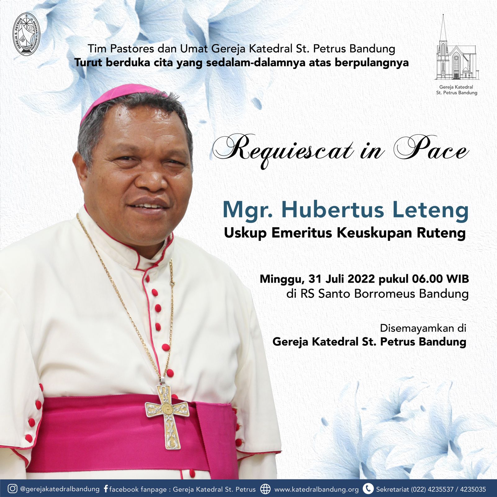 HIDUPKATOLIK.COM – “Berita duka pagi ini, Mgr. Hubert Leteng meninggal dunia di RS Carolus Boromeus Bandung pagi ini, Minggu, 31 Juli 2022. Beberapa hari ini dia dikabarkan sakit. Masih menunggu kabar selanjutnya tentang sakitnya dan acara acara terkait kematian beliau. Mgr Hubert lahir 1 Januari 1959. Ia ditahbiskan sebagai Imam Keuskupan Ruteng 1988. Dia Uskup Ruteng 2010 – 2017.”