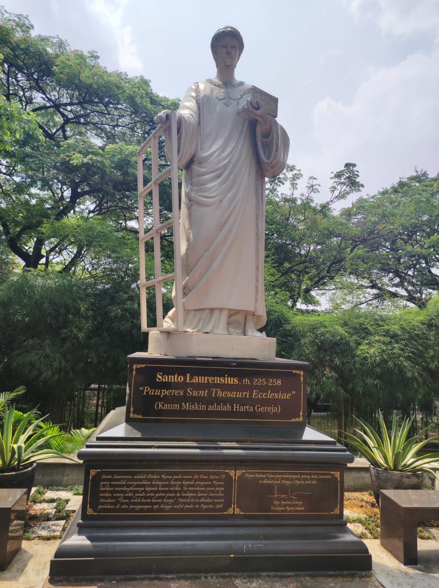 Nah di plaza depan gereja, ada sebuah patung yang besar,  berwarna putih. Ini adalah patung santo pelindung gereja, Santo Laurensius. Tangan kiri terlipat sambil memegang sebuah kotak sedangkan tangan kanan memegang rangka daun jendela. Jujur aku  bertanya-tanya, kenapa koq membawa-bawa daun jendela.