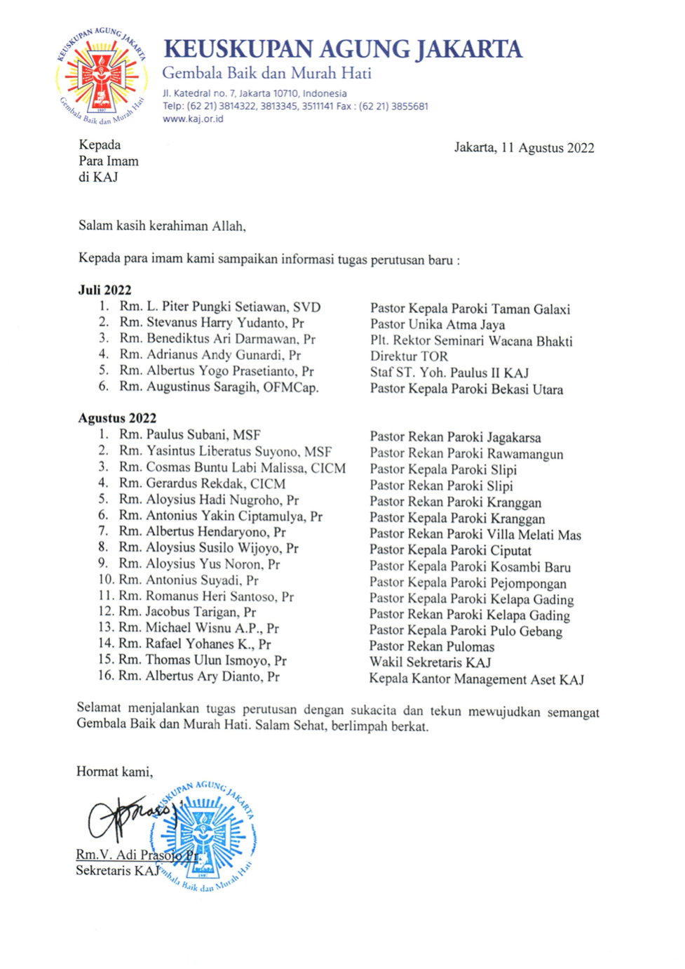 HIDUPKAOLIK.COM – Dalam suratnya kepada para imam yang berkarya di lingkungan Keuskupan Agung Jakarta (KAJ), tertanggal 11 Agustus 2022, Sekretaris KAJ, Romo V. Adi Prasojo, Pr mengumumkan adanya perutusan baru para imam. Selengkapnya isi surat, seperti di bawah ini yang kami ambil dari www.kaj.or.id.