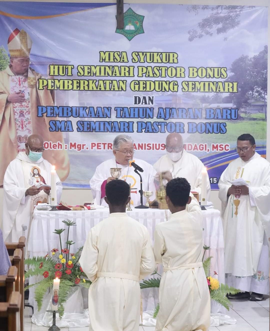 HIDUPKATOLIK.COM – Uskup Agung Merauke, Mgr. Petrus Canisius Mandagi, MSC bersama sebelas imam lainnya memimpin Misa pemberkatan gedung Seminari Pastor Bonus dan KPA St. Fransiskus Xaverius yang baru sekaligus dirayakan HUT Seminari Pastor Bonus yang ke-16 juga pembukaan tahun ajaran yang baru dari seminari Pastor Bonus dan KPA, Senin 15 Agustus 2022.
