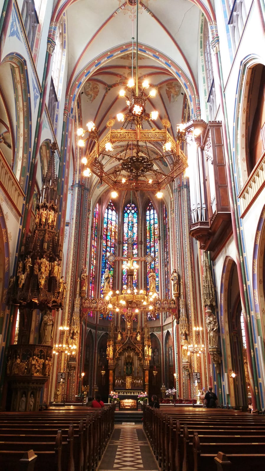 Untuk memperoleh cahaya matahari yang baik dan agar dapat menampung banyak umat, gereja ini sengaja didesain dengan langit-langit yang tinggi. Bagian tempat duduk umat sengaja didesain dengan pencahayaan yang redup, sedangkan bagian altar bermandikan cahaya dari pantulan cahaya matahari yang masuk melalui mozaik jendela. Seluruh dinding facade dibangun dari bata merah sewarna yang disusun secara bersilang. Desain facade yang satu warna berbanding terbalik dengan desain interior yang penuh warna (dominasi merah, hijau, biru). Meski demikian, gereja ini menjadi sebuah karya seni yang utuh.