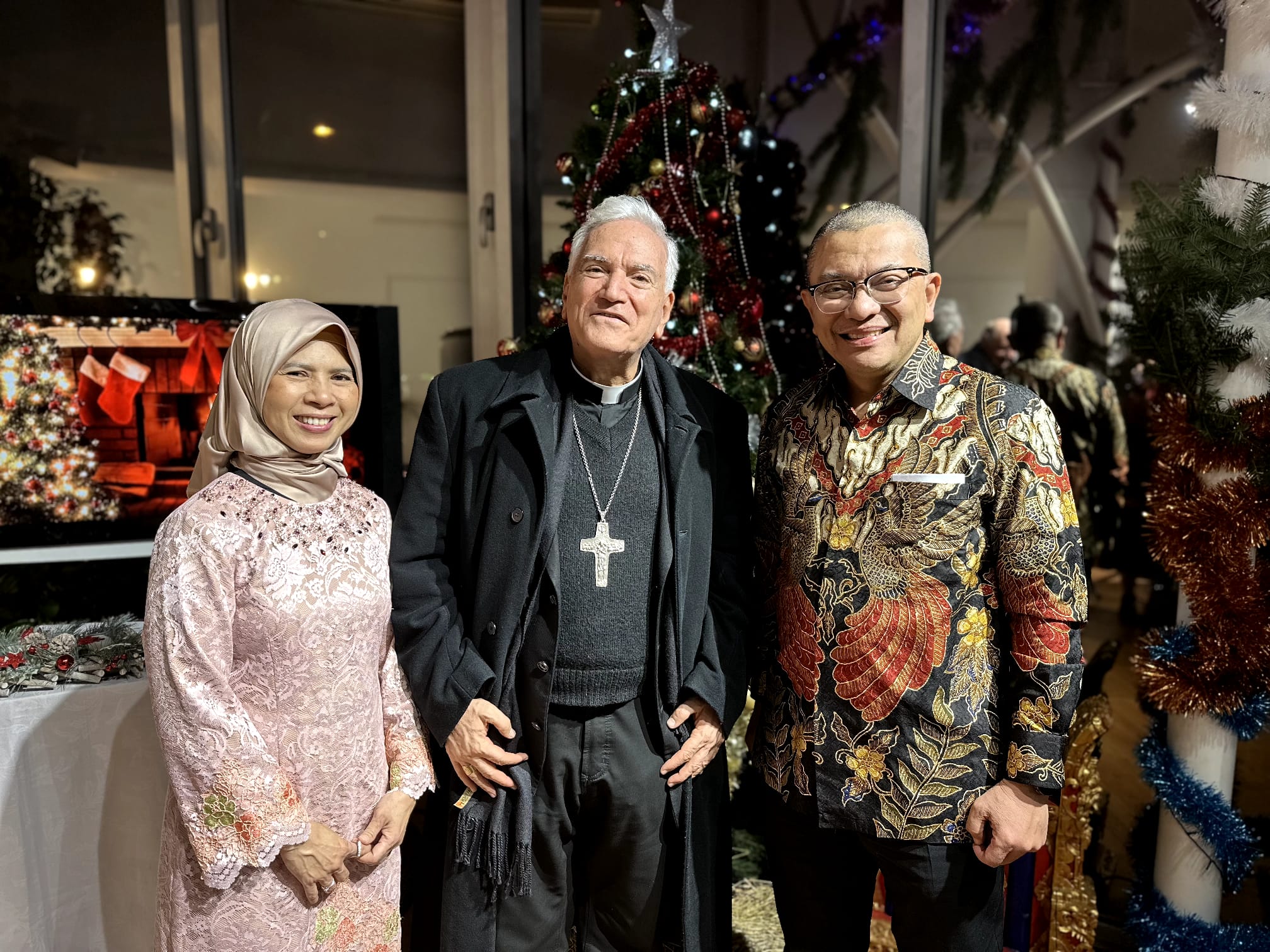 Nuncio Mgr. Nicola Girasoli diapit oleh Duta Besar Pribadi Sutiono dan istri Fenti.