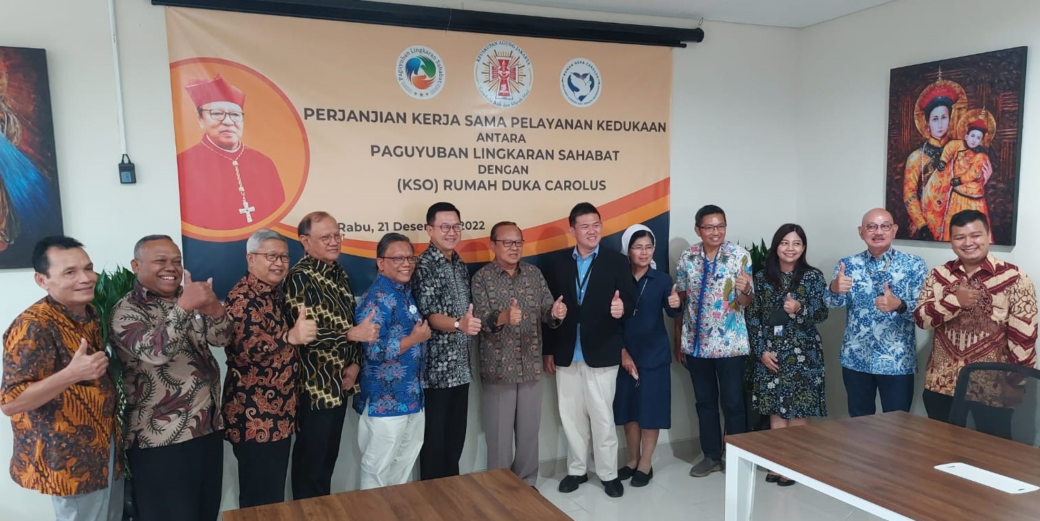 HIDUPKATOLIK.COM – Sebuah peristiwa penting berlangsung di lantai 4 Rumah Duka Carolus, Jakarta hari ini, Rabu, 21/12/2022. Dilangsungkan penandatanganan Perjanjian Kerja Sama Pelayanan Kedukaan antara Paguyuban Lingkaran Sabahat Mgr. I. Suharyo (PaLingSah) dengan Kerja Sama Operasi (KSO) Rumah Duka Carolus (RDK).