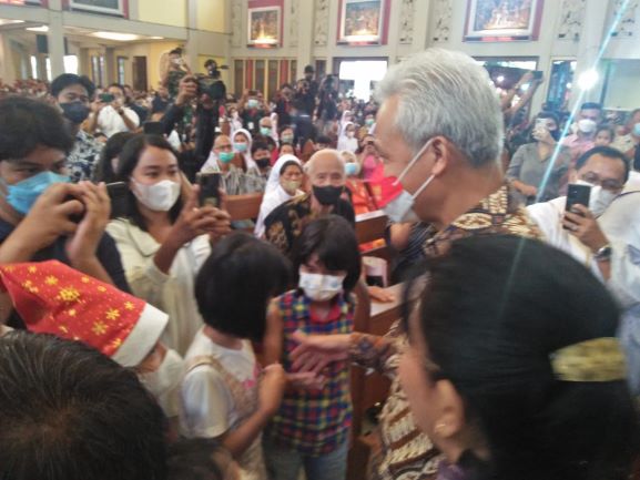 Pada kesempatan ini Ganjar memperkenalkan rombongan besar yang di bawanya. Dari Wakapolda, BIN Pusat, Kakanwil Kemenag, Kesbangpol, Kajati Jateng dan lain-lain. “Sejak kemarin saya lihat kebahagiaan terpancar dari matanya, kelihatan. Kami datang dalam perayaan Natal yang sumringah dan nderek mangayubagyo Bisa bertemu dalam suasana yang relatif bahagia karena sejak dua tahun lalu kita enggak bisa kumpul, hari ini bisa kumpul semua dan umat gereja ini tetap disiplin protokol kesehatan,” ucap Gubernur.