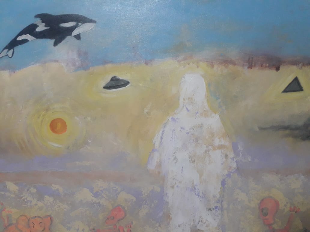 Yang menarik, dalam lukisan “Flat Earth” ini, tampak sosok bayangan manusia berjubah putih. Nah siapa Dia? Menurut Slamet, Dia adalah Yeshua, begitu ia menyebut-Nya. Yang adalah Yesus, Anak Manusia yang turun ke dunia menebus dosa-dosa manusia.