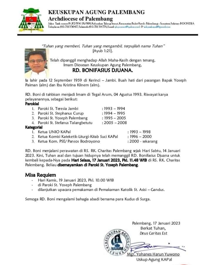 Berita duka itu disampaikan oleh Uskup Agung Palembang, Mgr. Yohanes Harun Yuwono dalam surat tertanggal 17 Januari 2023 di laman media sosial Keuskupan Agung Palembang, seperti tertera di bawah ini.
