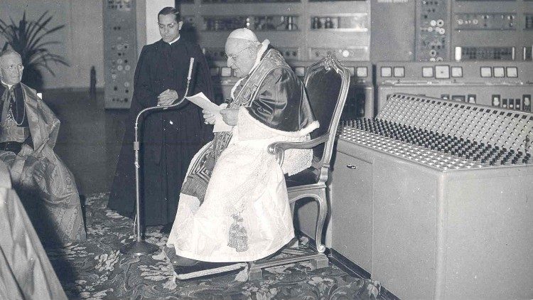 Arsip gambar Paus Yohanes XXIII (kanan) berbicara kepada dunia melalui mikrofon Radio Vatikan.