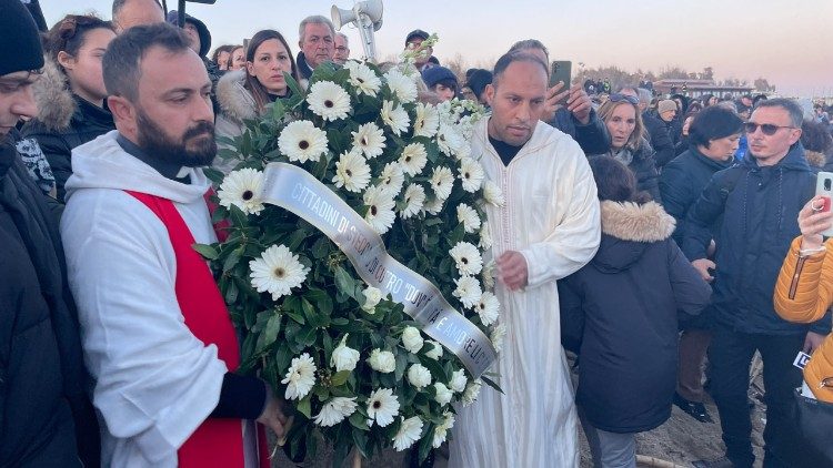 Di belakang Walikota, di bawah bayang-bayang lengan kayu salib, Uskup Agung Angelo Raffaele Panzetta dan Imam Masjid di Cutro, Mustafa Achik, berjalan berdampingan berdoa bersama untuk jiwa para korban, yang sebagian besar adalah dari iman Islam. Dengan stola merahnya, uskup mengatupkan kedua tangannya dalam doa; sang imam, diapit oleh putrinya Malak yang berusia 14 tahun, memegang permadani yang digunakan umat Islam untuk shalat lima waktu.