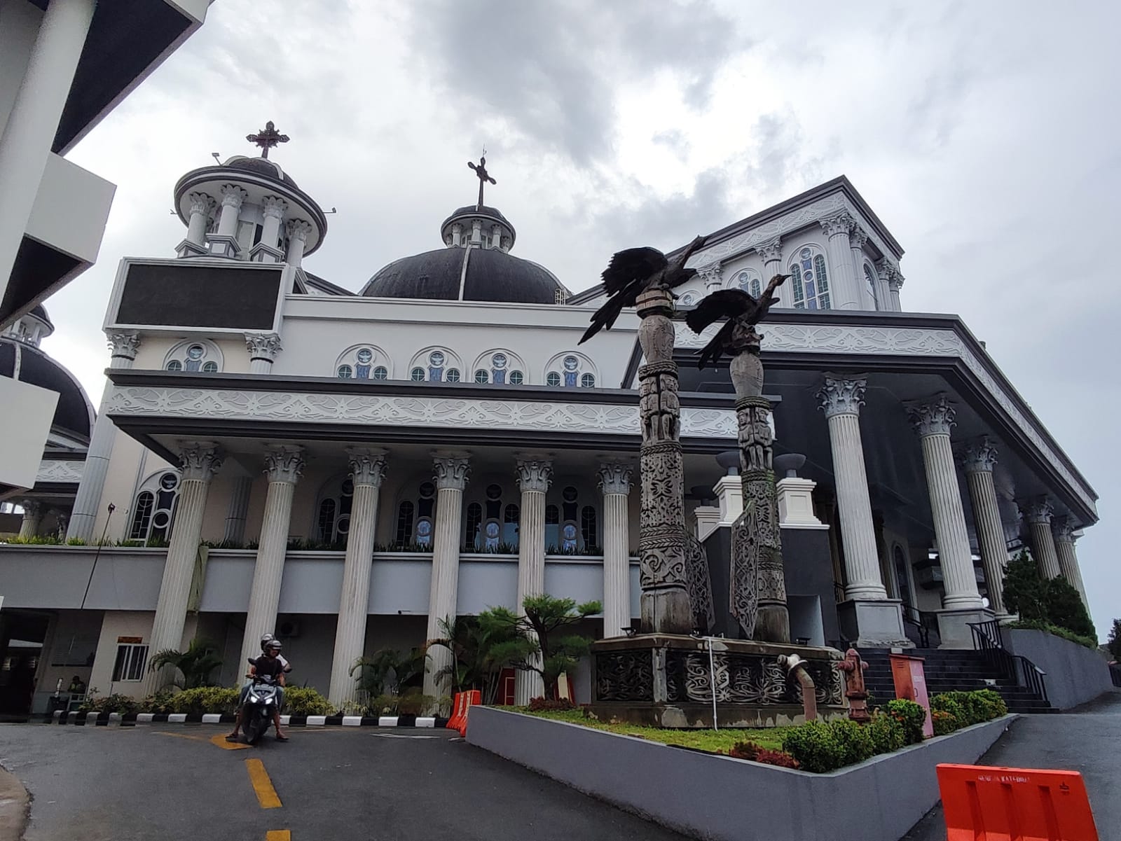 Selesai mencicipi mie kepiting di pusat kota, kami langsung menuju Katedral Pontianak yang terkenal indah. Beberapa ratus meter sebelum tiba, sudah terlihat kubah katedral yang besar. Tidak hanya satu, melainkan dua kubah lengkap dengan salib di atasnya. Makin dekat, makin nampak kemegahan Gedung Katedral St.Yoseph ini, yang telah diresmikan sekitar delapan tahun lalu, tepatnya pada 19 Desember 2014 oleh Gubernur Kalimantan Barat dan diberkati pada hari Raya St Yoseph, 19 Maret 2015 oleh Uskup Agung Pontianak Mgr. Agustinus Agus bersama Nuntius Apostolik.