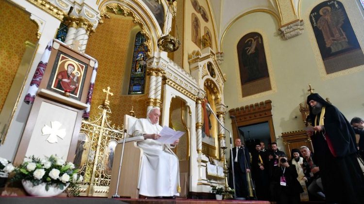 Bapa Suci disambut di Institut oleh direkturnya, György Inotay, yang menyambut Paus dengan doa Fransiskan untuk perdamaian, yang dibacakan dalam bahasa Latin.