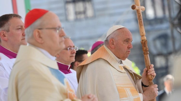 Setelah sambutan singkat dengan Uskup Agung, ada momen doa yang dipimpin oleh Paus Fransiskus bersama umat. Paus menyerahkan salib dan memberkati komunitas Katolik Yunani Hongaria.