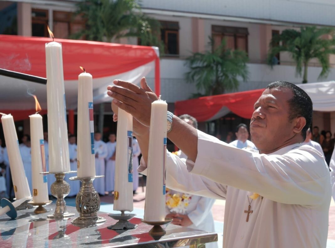 HIDUPKATOLIK.COM – Uskup Manado Mgr. Benedictus Estephanus Rolly Untu MSC di dampingi beberapa imam dan Frater Diakon Ivandi Raja memimin Misa puncak Jubileum 100 Tahun Frater CMM di Indonesia yang diselenggarakan Kongregasi Frater CMM Wilayah Sulut di Kompleks SD Frater Don Bosco Manado, Sabtu (20/5/2023).