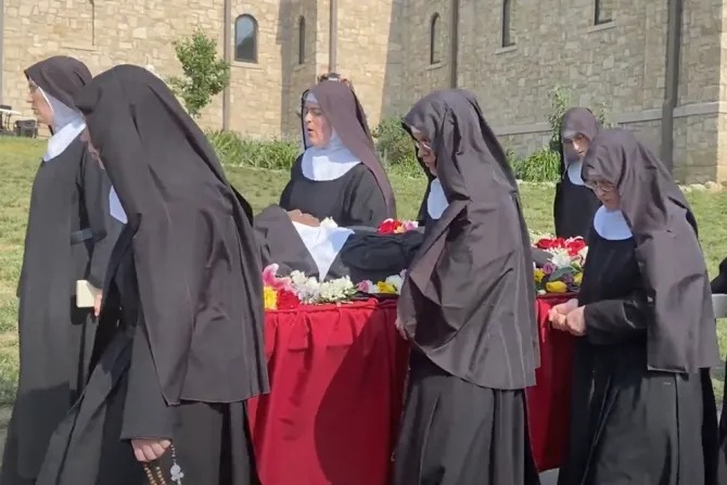Sekitar pukul 17.00, lusinan biarawati dari Benediktin Maria, Ratu Para Rasul, membawa pendiri mereka di atas mimbar di sekitar properti Biara Bunda Kita di Efesus, membacakan rosario dan menyanyikan himne. Beberapa dari ribuan peziarah yang mengunjungi biara selama tiga hari akhir pekan Hari Peringatan mengikuti di belakang.