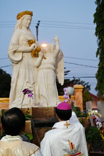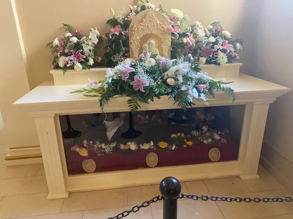 Prosesi, diadakan di bawah sinar matahari sore yang cerah, mencapai puncaknya di dalam gereja biara, di mana tubuh biarawati ditempatkan di dalam kotak kaca yang dibuat khusus. Bunga mengelilingi tubuhnya dan menghiasi bagian atas peti, di mana terdapat gambar St. Yosef menggendong Kanak-kanak Yesus. Gereja dipenuhi peziarah, termasuk banyak imam dan suster dari ordo lain.