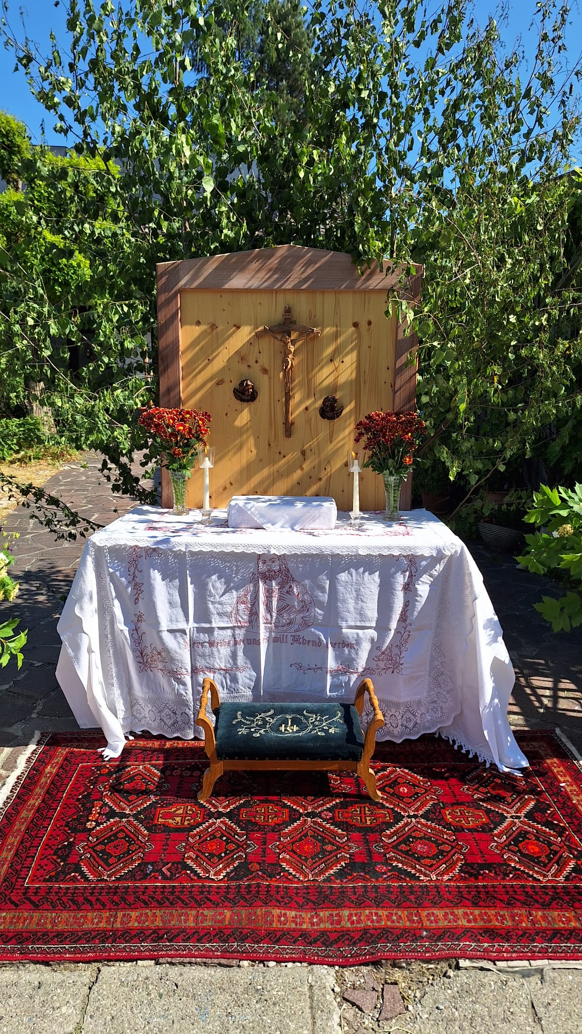 Di beberapa tempat bahkan rombongan ini diawali dengan putri-putri kecil yang menaburkan bunga mawar di sepanjang jalan. Taburan bunga ini disebut dengan Rosensregen (hujan mawar) sebagai sebuah simbol jalan menuju surga. Rombogan ini berhenti pada setiap stasi yang telah disiapkan dan didekorasi dengan sangat cantik, penuh bunga, kain-kain indah dan lilin.