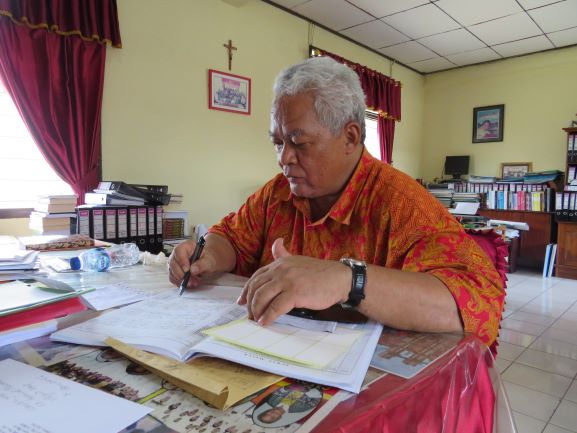 Mgr. Hilarion Datus Lega mengerjakan tugas di kantornya. (HIDUP/Katharina Reny Lestari)