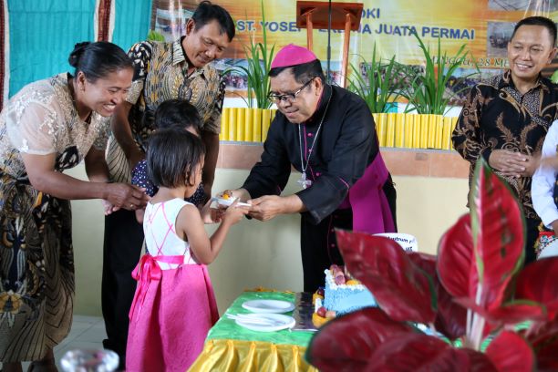“Maka hari ini, saya memotong kue ini dan meminta tiga anak kecil yang ingin menjadi pastor, suster, dan pegawai negeri sipil,” ucapnya. Dengan antusias, tiga anak kecil berlari dan menyambut kue yang diberikan Uskup. Lanjutnya sembari berharap, “Kita berdoa untuk kesuburan panggilan Gereja.”
