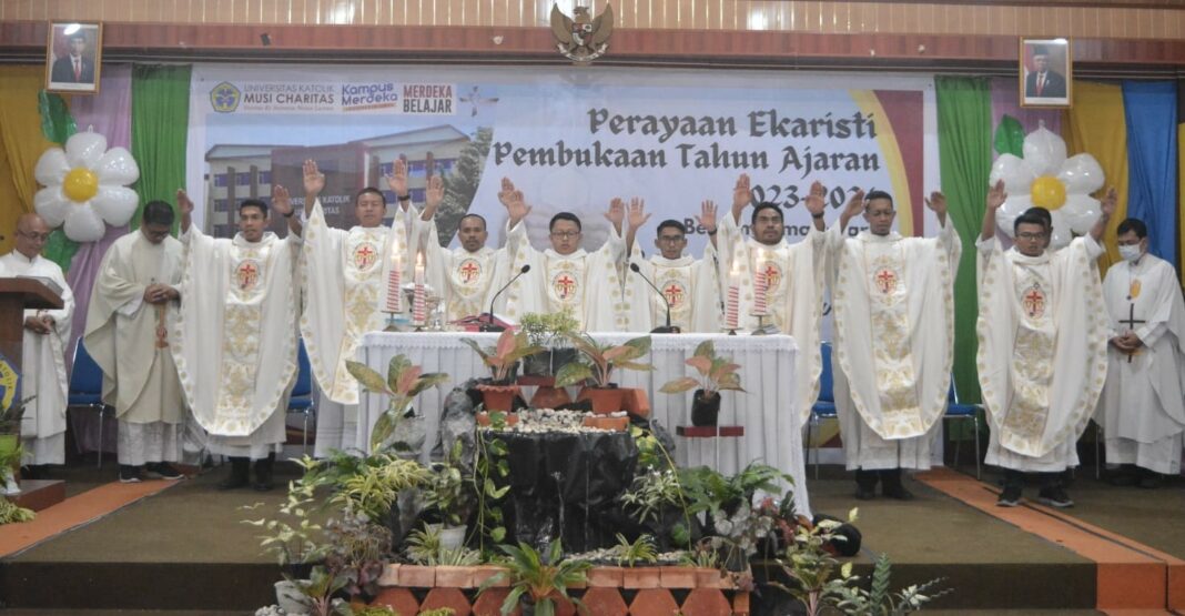 HIDUPKATOLIK.COM – “Semoga Perayaan Ekaristi yang istimewa ini, bersama para imam baru dan dengan jumlah imam yang banyak pada hari ini, sungguh membawa semangat dan berkat berlimpah bagi seluruh proses pelayanan dan pembelajaran di UKMC tercinta pada Tahun Akademik yang baru juga untuk tahun-tahun mendatang,” ungkap Rektor Universitas Katolik Musi Charitas (UKMC) Palembang, Sumatera Selatan, Antonius Singgih Setiawan dalam sambutannya pada Perayaan Ekaristi Pembuka Tahun Akademik 2023/2024, Jumat (1/9/2023) lalu.