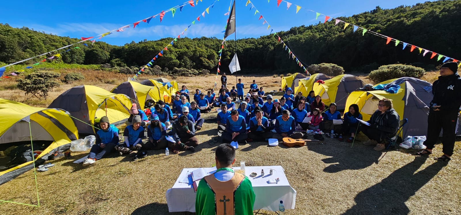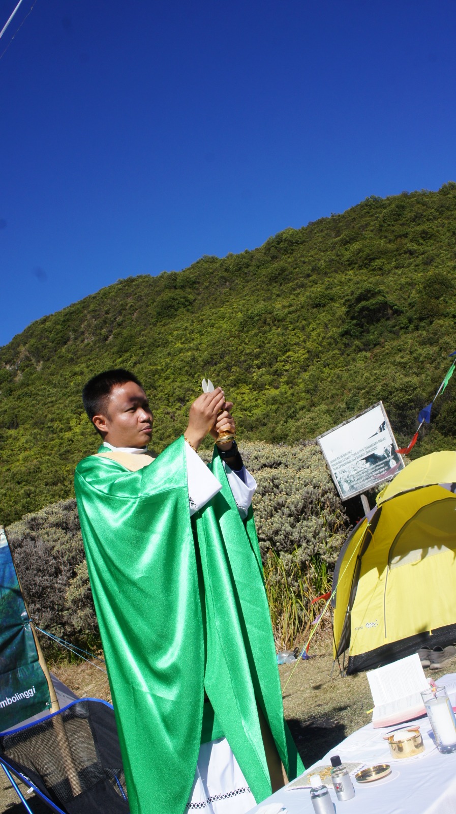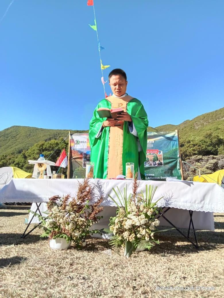 Di bawah langit biru yang cerah dan udara yang sangat dingin, Romo Alfonsus Sombolinggi mengajak umat untuk merenungkan bagaimana kasih Tuhan kepada manusia khususnya dengan menghadirkan alam ciptaan yang begitu indah.
