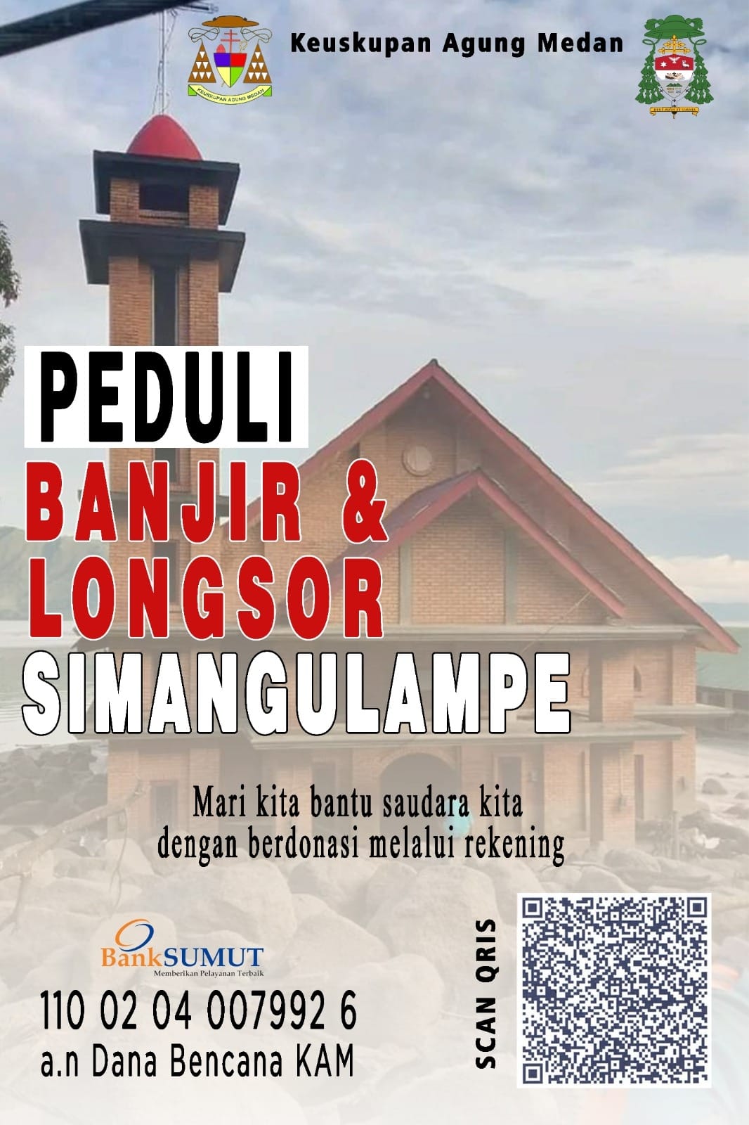 Bila ingin berdonasi bisa langsung ke Bank SUMUT, Nomor 110 02 04 007992 6 atas nama Dana Bencana KAM. “Mari kita peduli banjir dan longsor Sumangulampe. Mari bantu saudara-saudari kita dengan berdonasi,” ajak Mgr. Sipayung.