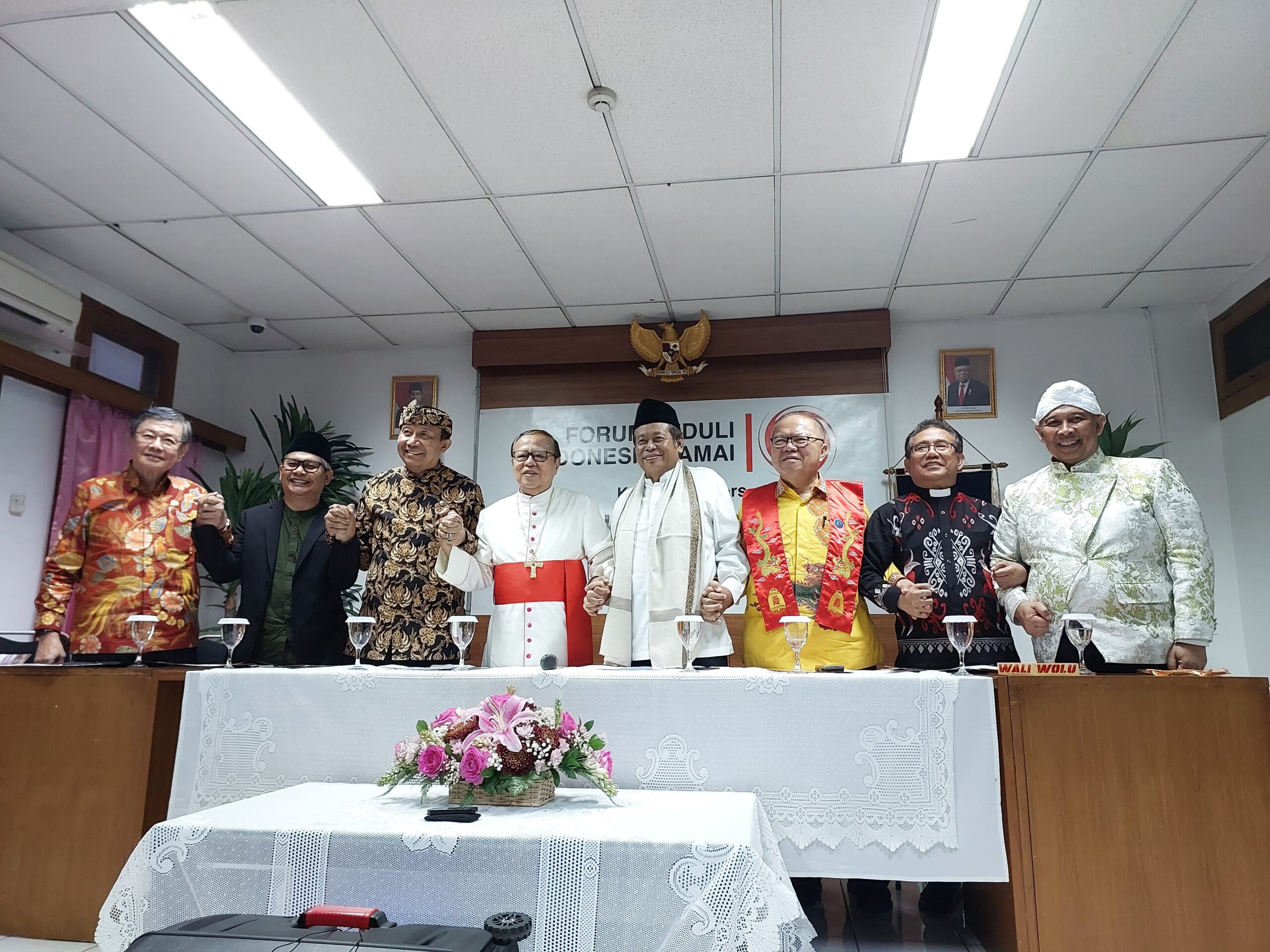 HIDUPKATOLIK.COM – Delapan tokoh agama yang tergabung dalam Forum Peduli Indonesia Damai, masing-masing mewakili agama Buddha, Hindu, Islam, Katolik, Konghucu, dan Protestan serta Spiritual Nusantara – sebuah aliran kepercayaan, meminta seluruh masyarakat dan para pemangku kepentingan bangsa untuk tetap menjaga persatuan, khususnya menjelang Pemilihan Umum (Pemilu) tahun depan.