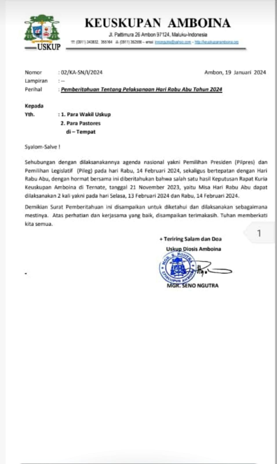 Keputusan ini disampaikan Uskup Amboina, Mgr. Seno Ngutra dalam surat pemberitahuan kepada para Wakil Uskup di wilayah pastoral Keuskupan Amboina.