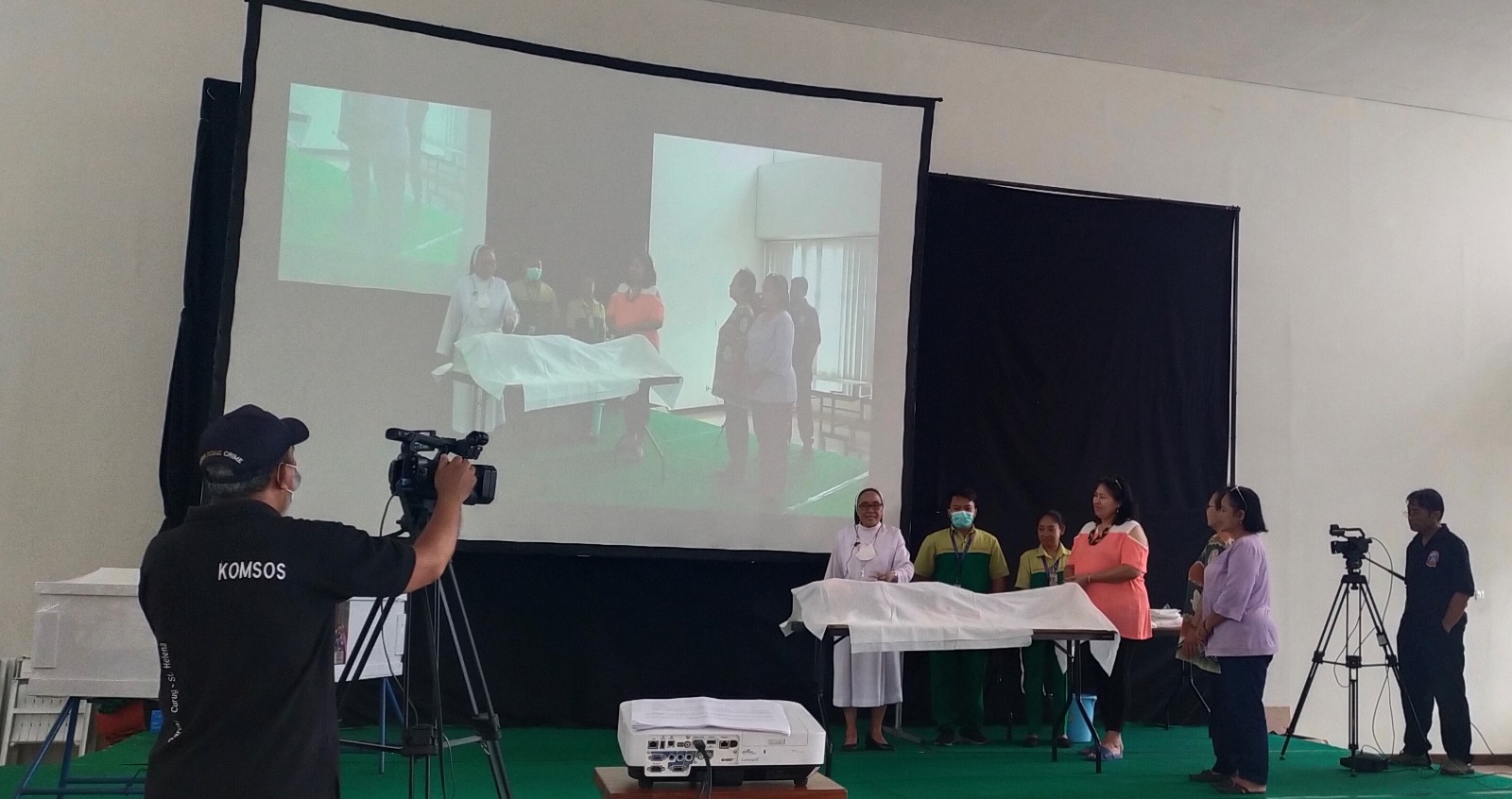 Dipandu Sr Yulia, perwakilan peserta berpratek merawat jenazah, peserta lain menyaksikan lewat layar yg disiarkan secara live oleh tim Komsos Paroki St Helena Curug (Foto: HIDUP/Anton Sumarjana)
