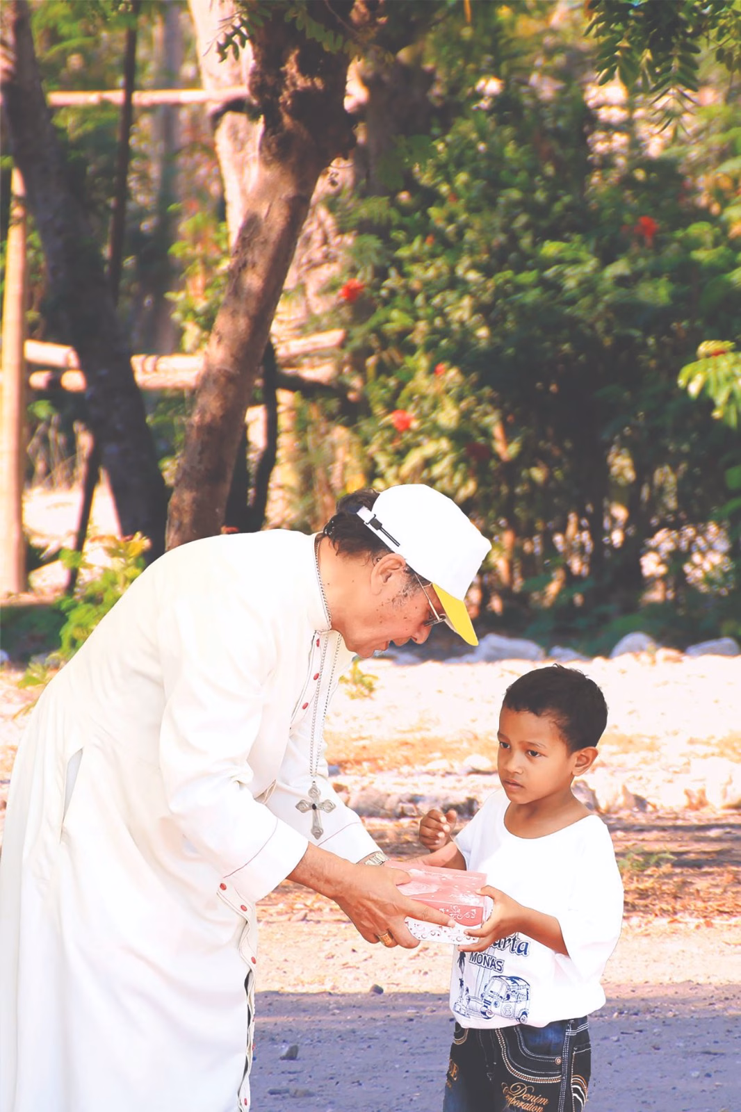 Mgr. Petrus Turang bersama seorang anak.