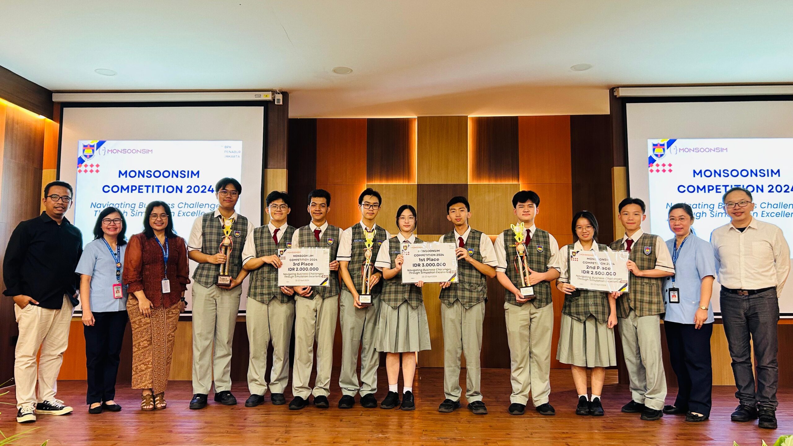 “Selain berkesempatan untuk melakukan simulasi, kemampuan para siswa juga diuji dalam kompetisi tahunan MonsoonSIM, yang di tahun 2024 ini merupakan penyelenggaraan yang ke 6. Awalnya digelar bagi sekolah yang mempunyai ciri khas entrepreneurship, tetapi dalam 2 tahun terakhir dibuka kesempatan bagi seluruh sekolah,” ujar Lie Fong Fong, Kepala SMAK 5 PENABUR dan Ketua Penyelenggara MonsoonSIM 2024. Ia menambahkan pada tahun ini sebanyak 62 tim dari 16 sekolah dengan total peserta 186 siswa turut berpartisipasi.