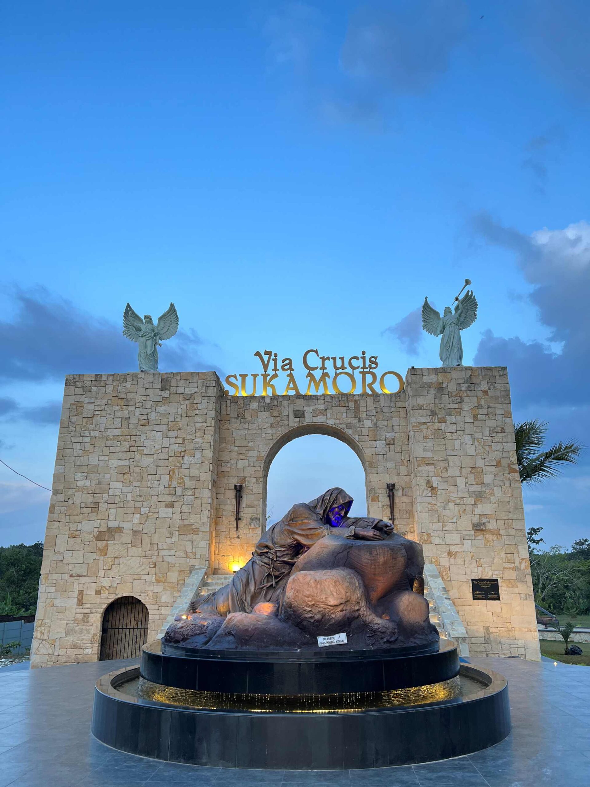 HIDUPKATOLIK.COM – VIA Crucis Sukamoro terletak di Daerah Banyuasin. Jaraknya sekitar 16 kilo meter dari pusat Kota Palembang, Sumatra Selatan. Kompleks dengan luas sekitar 1,5 hektare ini didesain dengan bentuk Classic Middle East. Bangunan didominasi kombinasi bentuk garis lurus, kubus, dan lengkung. Misalnya, bentukan pintu gerbang, yang merepresentasikan gerbang Kota Yerusalem yang megah nan agung. Di atasnya, hadirlah dua figur malaikat yang siaga, seakan menjadi penanda, bahwa Allah selalu menjaga dan menolong anak-anak-Nya memasuki kota suci-Nya.