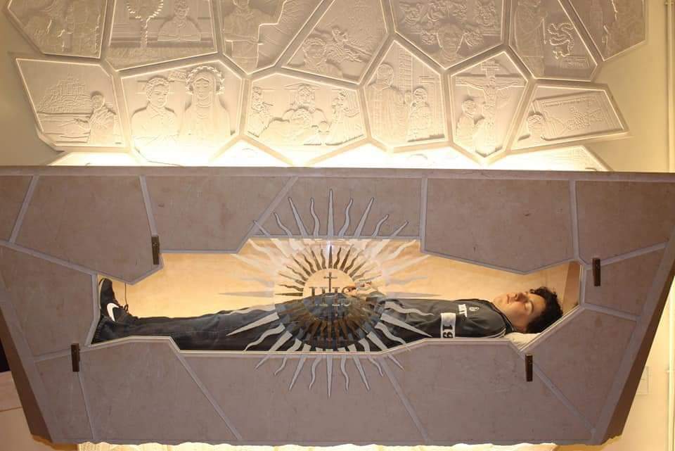 Mengenakan sepatu, Beato Carlo Acutis di makamnya di Kota Assisi, Italia. Dalam waktu dekat, akan dibeatifikasi menjadi santo.