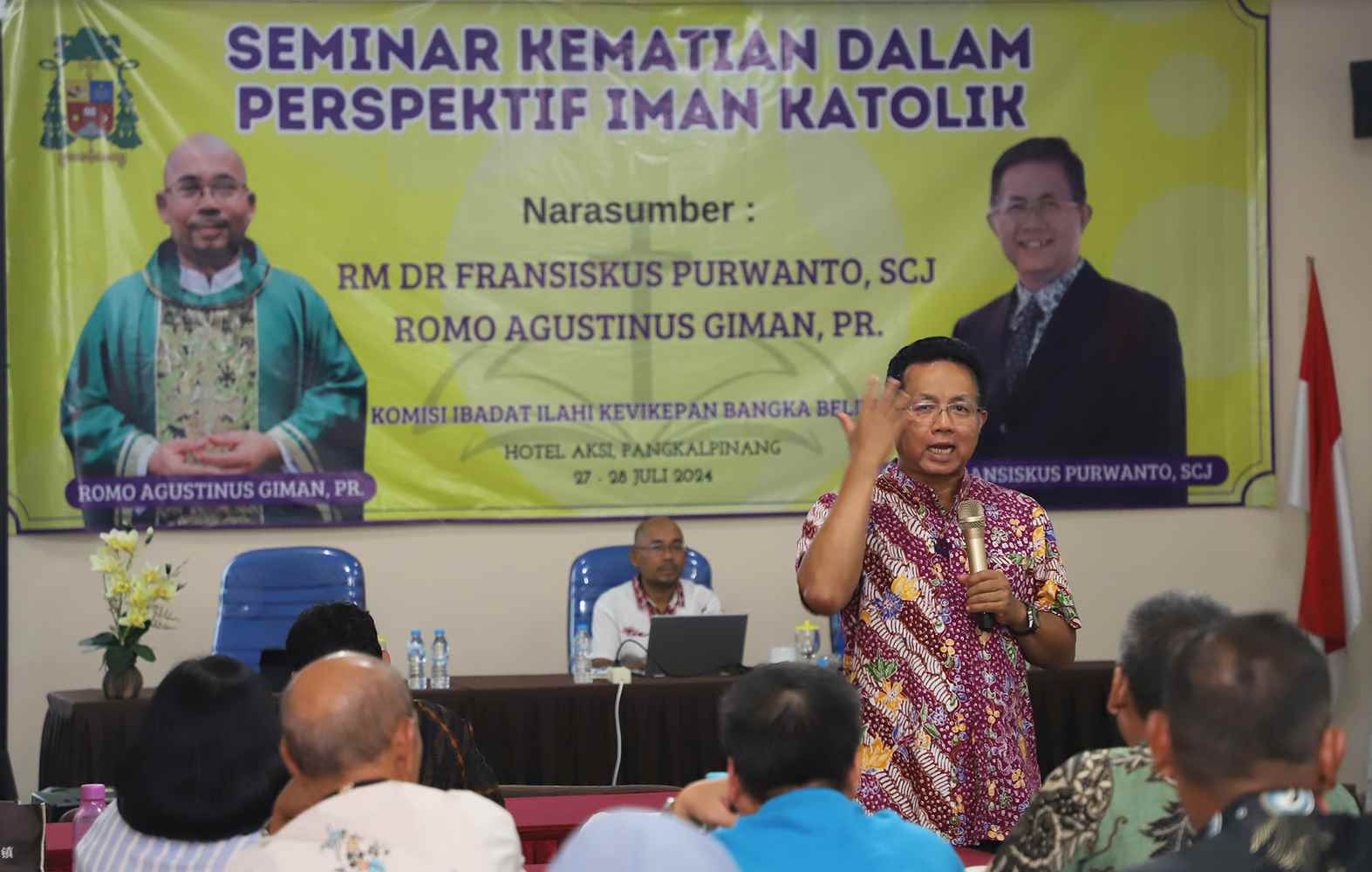 HIDUPKATOLIK.COM – Judul di atas merupakan tema seminar yang pada Sabtu-Minggu (27-28 Juli 2024) di Pangkalpinang. Seminar ini diselenggarakan dengan tujuan untuk menyegarkan dan menambah pengetahuan dan pemahaman para pelayan pralayan  berkaitan dengan tradisi kematian dan iman akan hidup kekal menurut ajaran Gereja Katolik. Selain itu, seminar ini diharapkan  dapat membantu Komisi Ibadat Ilahi untuk membarui buku panduan baru tentang tata perayaan seputar kematian yang selama ini digunakan di paroki-paroki.