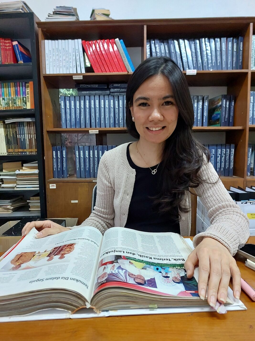“Sebenarnya aku sudah tahu Majalah HIDUP sejak lama. Aku sempat tanya beberapa kali melalui pesan WhatsApp, apakah bisa mengakses secara online. Sebenarnya bisa, cuma aku cari materi mulai tahun 2013 saat Paus Fransiskus diangkat. Belum tersedia data digital, jadi mau enggak mau aku ke sini,” ujar Apryanti Madah Munthe.