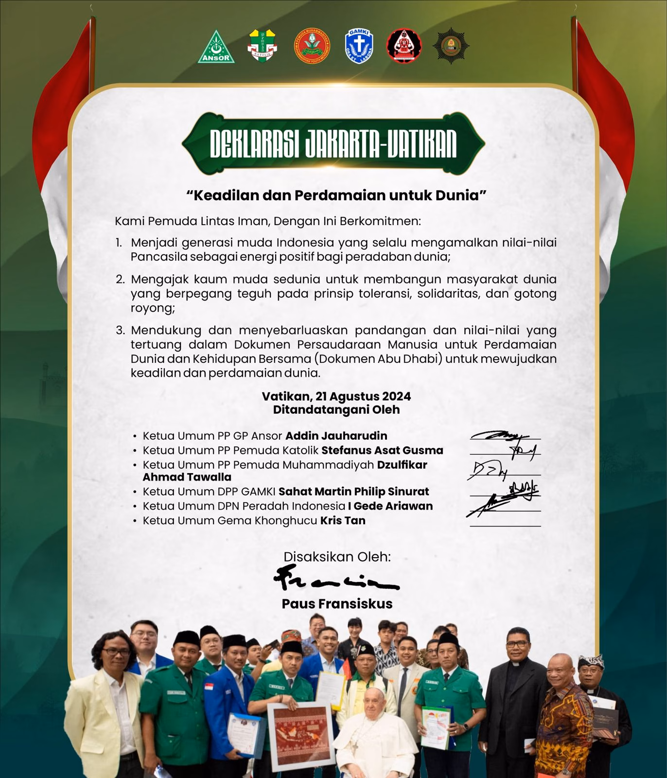 Pada kunjungan ini juga diadakan tandan tangan Deklarasi Jakarta-Vatikan untuk Keadilan dan Perdamaian Dunia oleh para pimpinan organisasi. Deklarasi ini berisi tiga poin komitmen tentang keterlibatan generasi muda untuk mengamalkan Pancasila, membangun masyarakat yang berpegang pada prinsip toleransi, solidaritas, gotong royong, serta berkomitmen menyebarluaskan nilai-nilai yang tertuang dalam Dokumen Abu Dhabi.