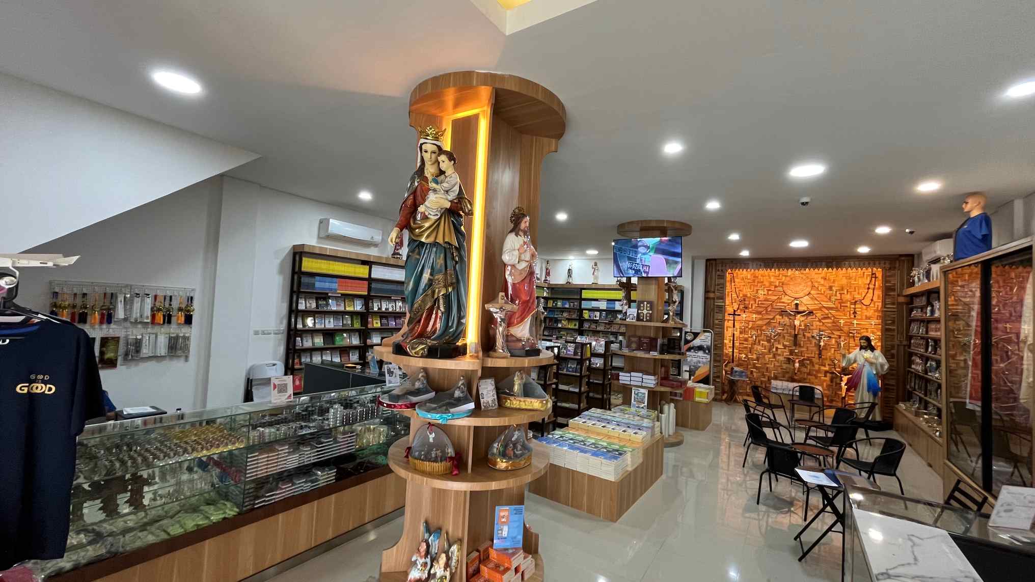 HIDUPKATOLIK.COM – KETIKA memasuki sebuah ruang berukuran 8×16 meter, para tamu langsung terpikat oleh sudut ruang beraksen altar gereja. Cahaya temaram kekuningan membias di dinding kayu, menyuguhkan rasa tenang dan damai. Sementara salib-salib kayu aneka motif dan ukuran yang bergelantung di dinding bermotif anyaman memberi aksen khidmat. Patung Yesus Kerahiman Ilahi setinggi hampir dua meter menjadi penjaga di sisi kiri bagian depan. Selebihnya, hampir seluruh ruang berdindingkan rak-rak dengan corak alami klasik. Isinya benda-benda devosional dan liturgi serta buku-buku.