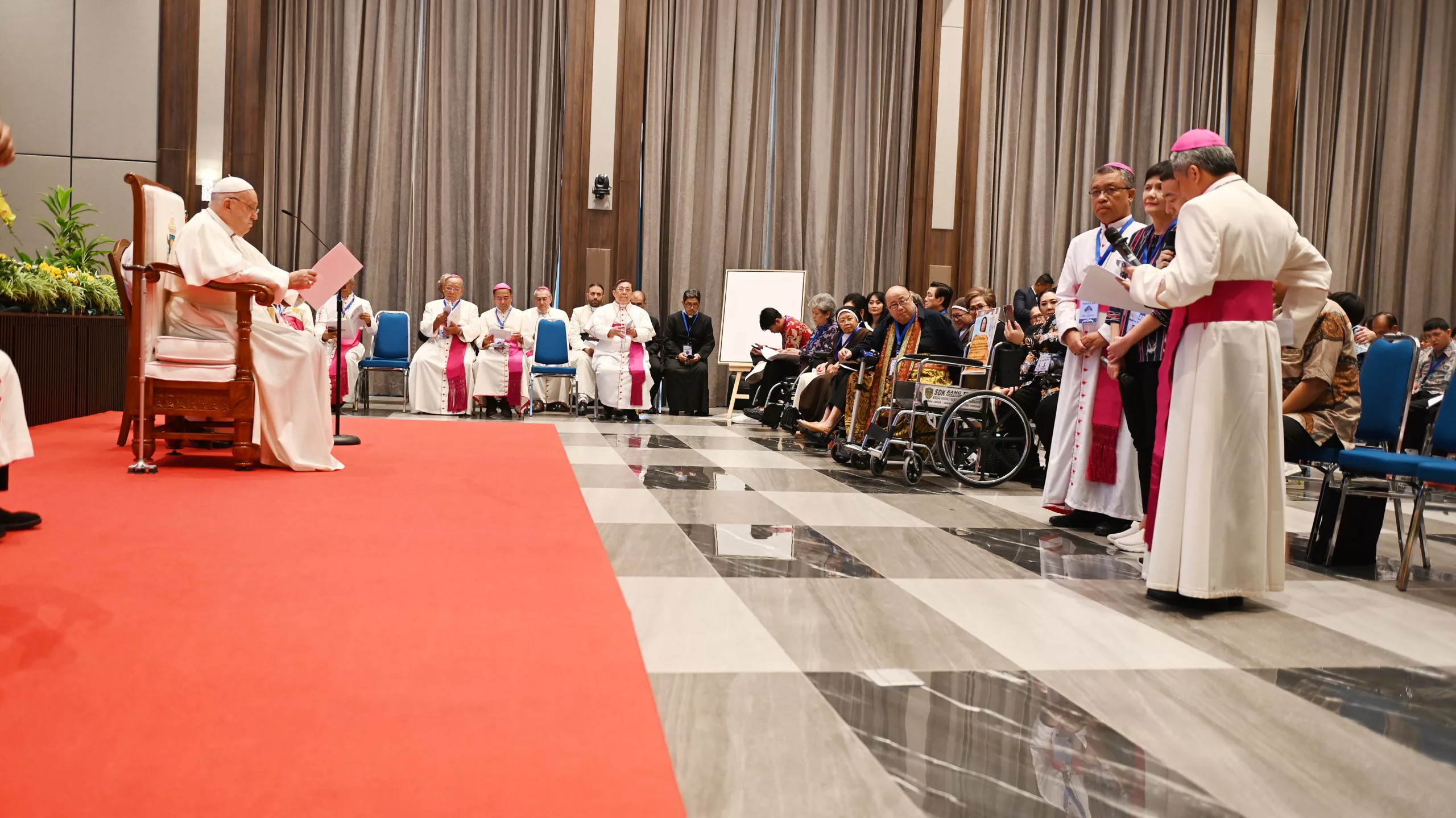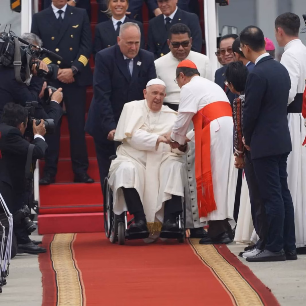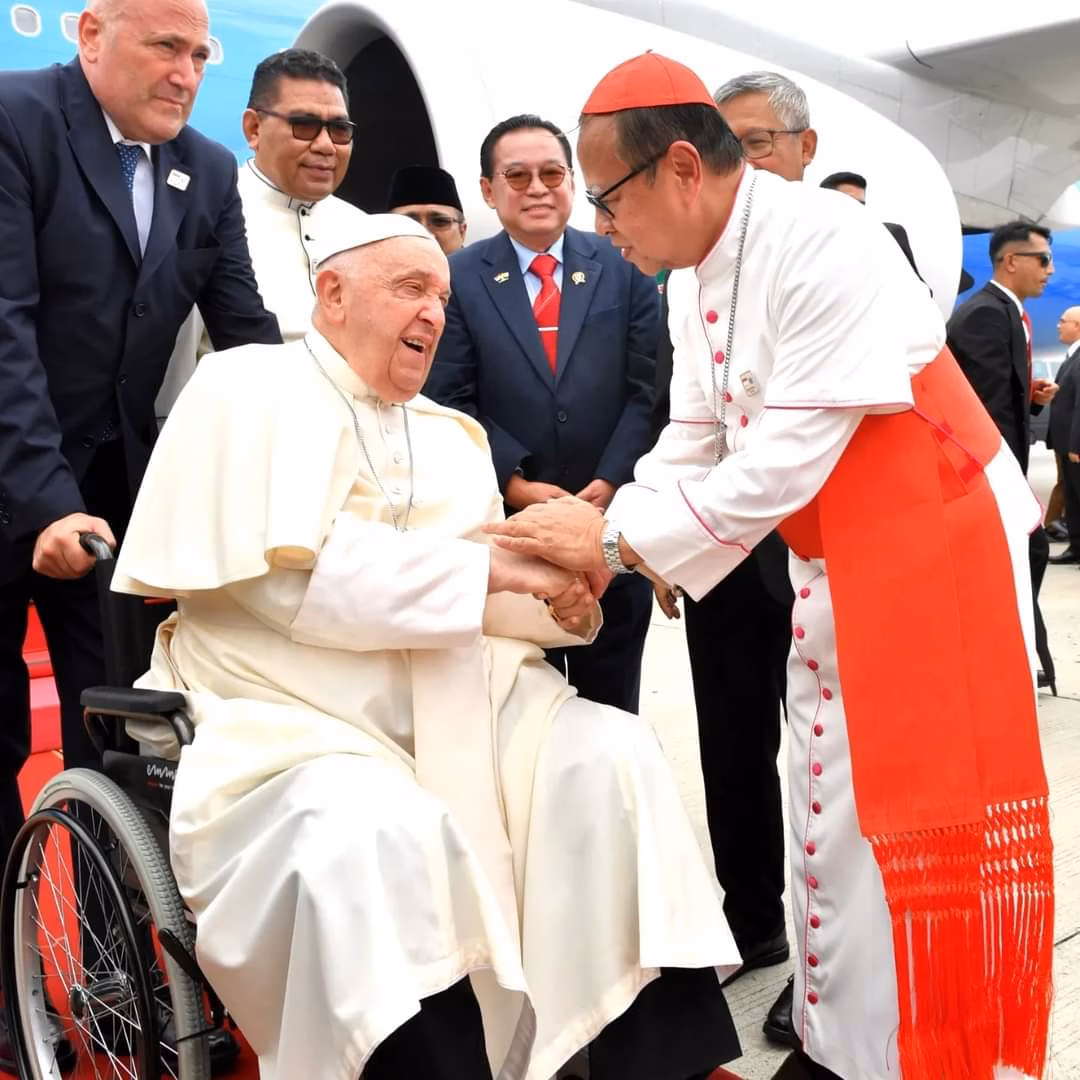 Paus Fransiskus turun dari pesawat dengan menggunakan kursi roda melewati sebuah crane. Didampingi Anggota Dewan Kepausan Dikasteri untuk Dialog Antar Umat Beragama Vatikan, Pastor Markus Solo Kewuta, SVD, ia menerima sambutan hangat dari dua anak, masing-masing bernama Mary Lourdes Wicaksono Atmojo (6) dan Irfan Wael (12), yang menyerahkan karangan bunga yang melambangkan Bhinneka Tunggal Ika, semboyan Bangsa Indonesia yang tertulis pada lambang negara, Garuda Pancasila.