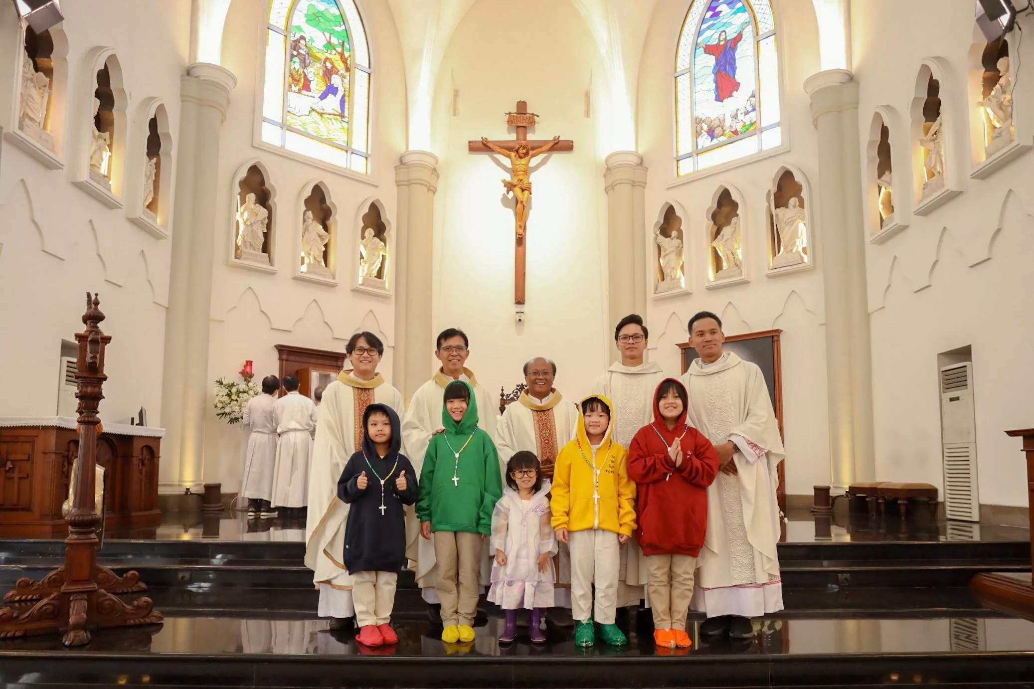 Beberapa menit menjelang pukul 8.30 nampak prosesi petugas liturgi berjalan dari arah ruang Sakristi bawah, melintas ruang aula yang sudah hampir penuh dengan umat, keluar menuju area parkir, lalu berbelok menapaki ram menuju lobi pintu utama. Dalam barisan prosesi, berjalan di depan, ada empat anak-anak yang mengenakan jaket hoodi. Ada yang kuning, merah, hijau, dan biru. Anak-anak nan lucu dan menggemaskan ini berperan sebagai Luce, Fe, Xin, dan Sky.