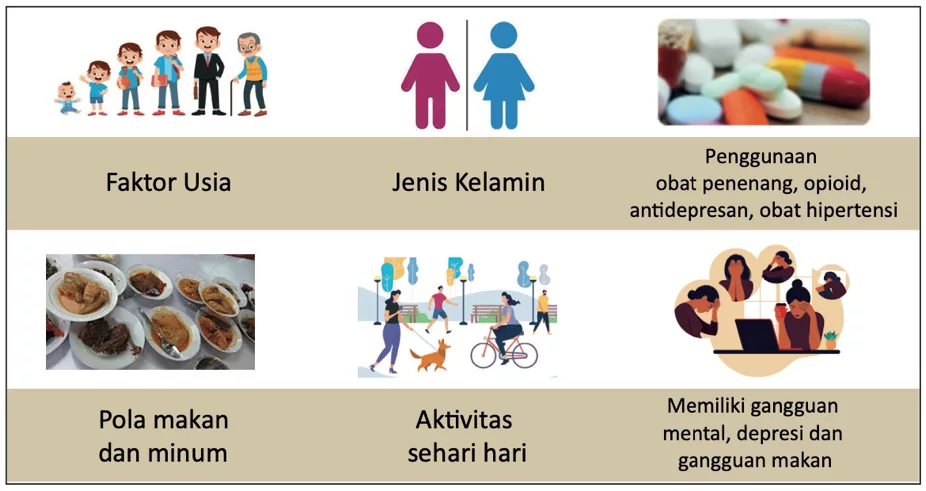 Selain faktor faktor diatas, terdapat faktor risiko yang juga berkontribusi pada konstipasi yaitu usia lanjut, jenis kelamin wanita, riwayat penyakit gastrointestinal, dan kondisi medis tertentu seperti diabetes mellitus serta hipotiroidisme.