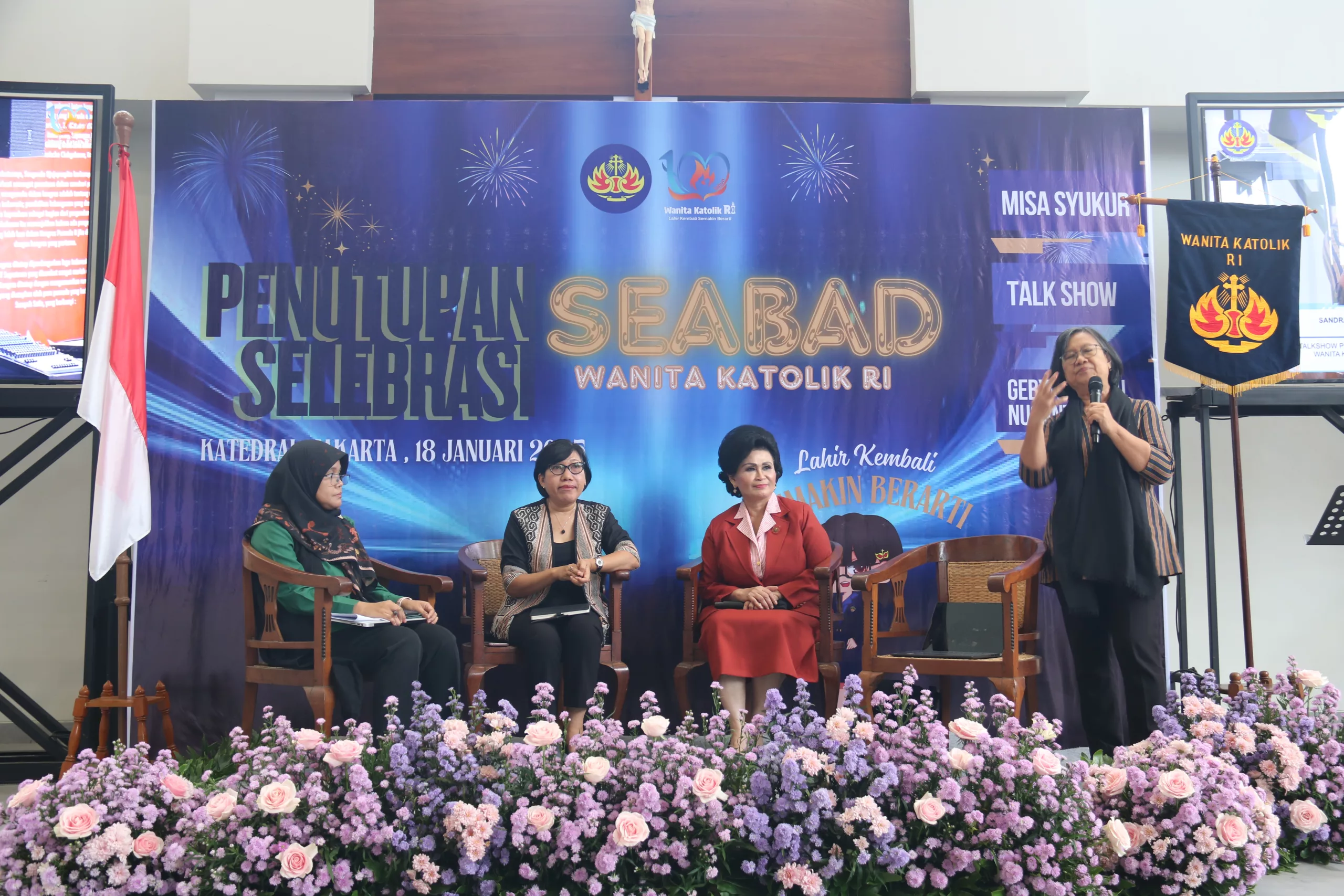 Acara Talk Show dengan pembicara Maya Septi dari Kementerian PPA; Ketua Umum KOWANI Nannie Hadi Thajjanto, Komisioner Komnas Perempuan Theresia Sri Endras Iswarini bersama moderator Sandrayati Moniaga. (HIDUP, Katharina Reny Lestari)