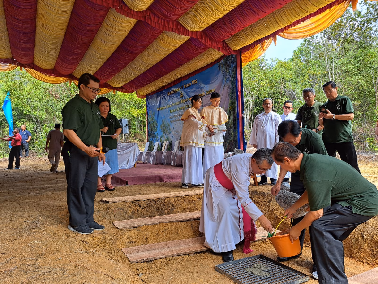 Peletakan batu pertama dilakukan oleh Monsinyur Adrianus Sunarko, dilanjutkan oleh Ketua Badan Pembina Yayasan TBS; Eddijanto, Ketua Yayasan; Thomas Jusman yang diwakili oleh Ardijanto, Ketua bidang pembangunan; Bunardy, Pastor Paroki; Pastor Antonius, Pastor Paroki Katedral Pangkalpinang; Pastor Yustin, Pastor Polce, Pastor Stanis, konsultan arsitek; Supie dan Ibu Maria, konsultan manajemen konstruksi; P. Lekso Wibowo, projek manajer; Andi Prayitno, dan para donatur; beberapa diantaranya yaitu Corri Tanopo dan Magda. Masing-masing dari mereka membawa doa dan harapan yang sama untuk kelancaran keberlanjutan pembangunan yang rencananya akan rampung pada tahun 2026.