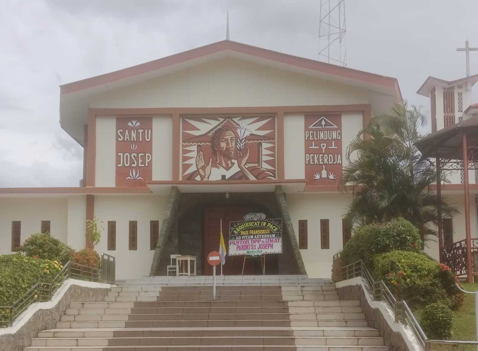 Krans ucapan turut berdukacita/RIP dipajang di dpn Paroki St. Josep Pelindung Pekerja Manado. (Foto: Lexie Kalesaran)