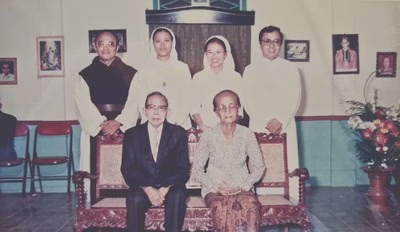 2. Empat dari 10 bersaudara sebagai biarawan/rohaniwan di Sedayu, November 2007. Berdiri dari kiri ke kanan: P. Suibertus Arie Sunardi OCS0 (alm), Sr. Christina Sri Murni FMM, Sr. Margaretha Maria Marganingsih PMY, Kardinal Ignatius Suharyo. Duduk: Florentinus Amir Hardjodisastro (alm) dan Theodora Murni Hardjodisastro (almh). Satu kemenakan Pastor Benedictus Sunar Djoko Pranoto, SDB (tidak kelihatan). Foto: Dok. Keluarga