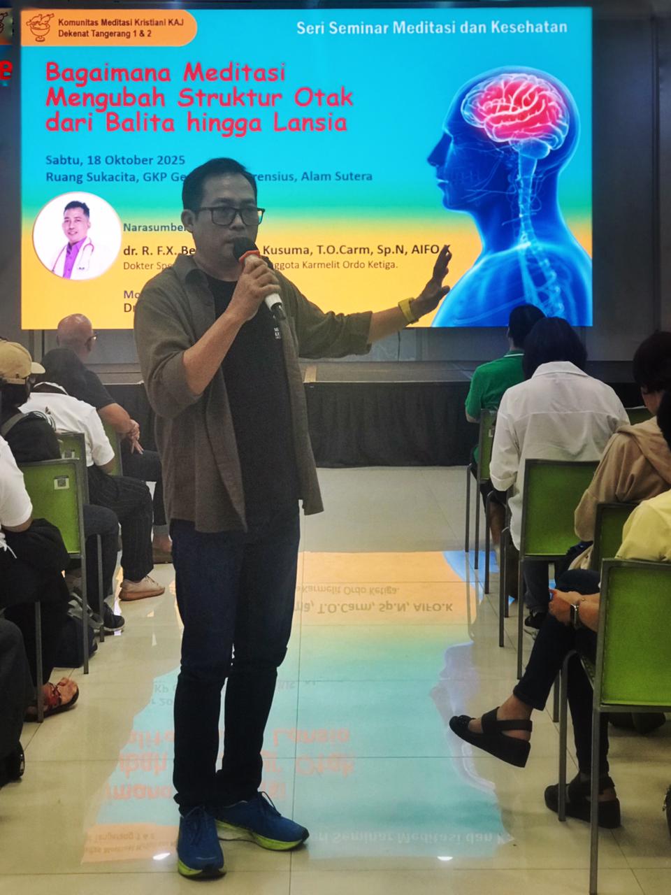 Dalam seminar bertajuk “Bagaimana Meditasi Mengubah Struktur Otak dari Balita hingga Lansia” pada Sabtu, 18 Oktober di Ruang Sukacita, Gedung Karya Pastoral Paroki Alam Sutera, beberapa kali dr. R. F.X. Berjanto Tera Kusuma, T.O.Carm, Sp.N., AIFO.K,  pelaku meditasi kristiani asal Surabaya, menyatakan bahwa sehat itu murah, sakit itu mahal. Dokter spesialis neorolog ini menjelaskan manfaat meditasi bagi kesehatan.