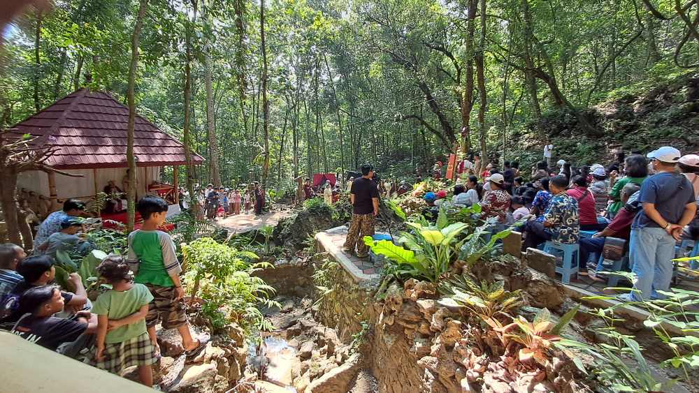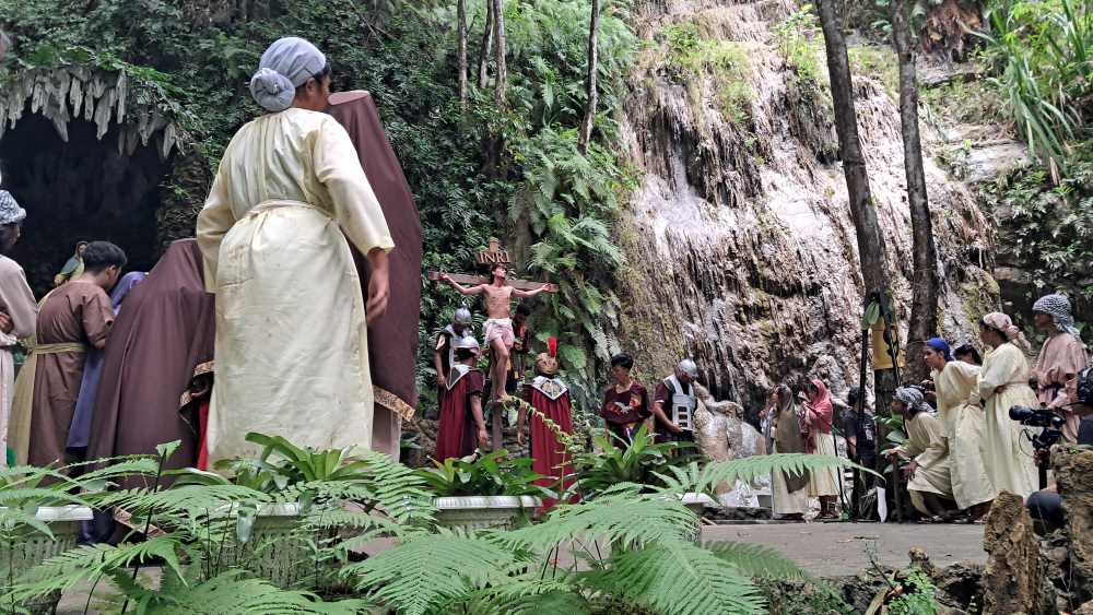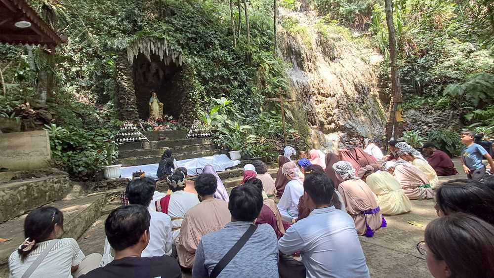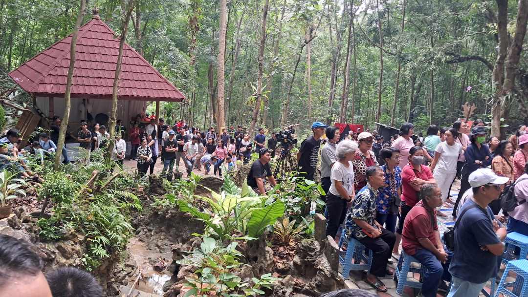 Umat juga tampak hening, khusyuk mengikuti seluruh adegan tablo yang berpuncak dengan penyaliban Yesus di sebelah gua Maria.