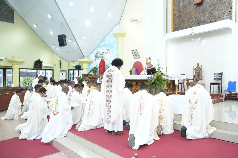 Uskup Agung Merauke, Mgr. Petrus Canisius Mandagi, MSC (pegang tongkat) bersama para imam. (HIDUP/Komsos Keuskupan Agung Merauke. Foto hanya untuk  ilustrasi tulisan.